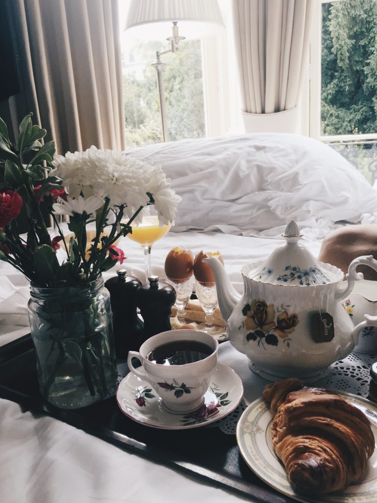 サービス面・施設面では、観光客向けのフルサービス・ホテルというより、お洒落な都会の隠れ家風。 朝食サービスはお部屋に運んでもらうことにしました。 イギリスではお馴染みらしい、朝食の定番「Egg and Soldiers(エッグ&ソルジャーズ)」 とろとろゆで卵に細長く切ったトーストを付けて食べます。 細長く切ったトーストが、ベアスキンと呼ばれる背の高い帽子をかぶって直立している英国の衛兵に似ているのでそう呼ばれているそう。 ここでのゆで卵は、「ソフト・ボイルド・エッグ」と呼ばれる、卵黄がとろとろの半熟状態でなければいけないみたいです。